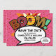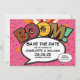 Featuring love hearts confetti, a fun, cool and trendy comic book inspired save the date card that puts the wham, zap, pow into your wedding date announcement. The reverse features a matching love hearts confetti on a pink comic book polka dot pattern which you can replace with your own image or photo. Designed by Thisisnotme©