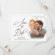 This modern photo save the date announcement features a hexagon photo frame on a clean white background. The design is accented with elegant script, and custom text for the wedding date, names and location. Additional text, on the back, allows you to add more wedding details.