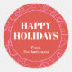 Make your gifts and envelopes stand out with this bold and festive round holiday sticker, featuring a bright red background, whimsical pink bow border, and “Happy Holidays” in crisp white typography. Below, your personalised family name adds a warm, custom touch. All texts are customisable.
