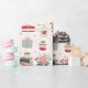 Wonderful pattern of holiday designs: stack of books to read, gifts, desserts, presents, mug filled with hot chocolate and flowers. Fun and unique cosy design of Christmas cheer.