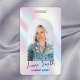 Trendy holographic design photo ID badge with modern script font and arch framed photo. This feminine employee badge with photo features elegant purple and blue gradient background and space for your name or logo. Perfect for aestheticians, nail artists, hair salons, makeup artists and more!