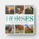 Custom horse picture plaque featuring a chic white background that can be changed to any colour, 6 square pictures of your pet animals, the horse quote "life is better with horses", and their names.