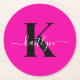 Modern Hot Pink Black Script Monogram Round Paper Coaster