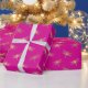 This wrapping paper features modern faux gold foil dragonfly pattern on hot pink background.