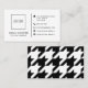 Professional and creative business card template features your logo and contact information. Simple bold modern classic black and white houndstooth pattern on back of card and classic white background (colour can be changed to whatever you want) with black text on front. Change, move and resize elements with the customisation tool. For additional matching marketing materials please email me at marisupaperco@gmail.com or send me a message via Zazzle chat. Original design by Marisu Valencia.