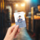 A modern minimalist ID badge for a business consultant or other professional title. Simple stylish typography for your name and title with a two tone blue and white background. Replace this sample photo with your own professional photo. Add your social media handle to the back of the badge.