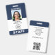 Create a professional appearance with a branded staff ID badge. This editable template can be personalised with your profile photo, name, job title, employee number, and company logo. Return details are on the back, along with additional information, and a QR code. Perfect for creating a cohesive branding experience, or simply to verify the identity of the wearer and display their qualifications. This identification badge is ideal for customer-facing roles and corporate settings — from business consultants and retail stores to medical professionals, hospital staff, office workers, conference teams, corporate events and more. Custom badges build brand identity and enhance security. Printed colours: very dark navy blue, grey and white. Vertical format.