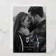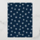 Modern holiday card featuring "joy" in a hand-lettered silver foil script with your name and the year shown below. The back of the silver foil Christmas card features a navy and white starburst snowflake pattern.