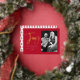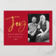 Modern foil holiday card featuring "Joy" in hand-lettered gold foil script with a festive red background. Personalise the front of the card by adding your favourite vertical photo, custom greeting, name, and the year. The reverse side of the card features a red and white modern Christmas tree pattern.
