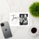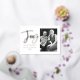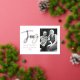 Modern foil holiday card featuring "Joy" in hand-lettered rose gold foil script with a white background. Personalise the front of the card by adding your favourite vertical photo, custom greeting, name, and the year. The reverse side of the card features a black and white modern Christmas tree pattern.