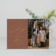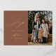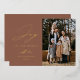 Modern holiday photo card featuring the phrase "Joy to the World" in elegant gold foil script with a mocha brown background. Personalise the front of the elegant holiday card with your family name, year, and vertical photo.
