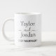 The design features a crisp white ceramic finish with the couple's names, "Taylor and Jordan," displayed in elegant serif and script typography. A bold "JUST MARRIED!!!" message adds a playful touch of excitement to this timeless minimalist design. Whether used as a honeymoon memento, a wedding morning prop, or a thoughtful gift for the happy couple, this mug serves as a beautiful daily reminder of a special day.