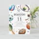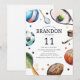 These sports themed birthday party invitations, featuring modern and playful watercolor images of sports balls, including tennis, football, basketball, rugby, hockey, table tennis, volley ball and also a lacrosse stick, which have been placed over a white background.