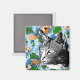 Modern koi fish pond background with a large black and white cat illustration magnet.