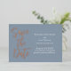 These save the date cards feature a modern, and elegant design on a dusty blue background. "Save the Date" is printed in gold foil, with a large font in a script, handwritten style. The wedding or event information is printed on the right.