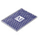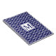 This modern, trendy notebook features a white geometric lattice all-over design with a navy blue coloured background. In the centre is a framed monogram letter in the same navy colour.
