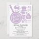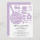 Stylish lavender & white stock the kitchen wedding shower invitation featuring kitchen tools including a frying pan, hand mixer, kitchen timer, pot, utensils, apron, whisk, measuring cup, pot holder & cups. Visit our shop to view this kitchen shower invite in other colours & matching recipe cards