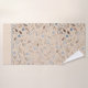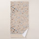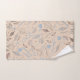 On this stylish towel set is a light tan backdrop with leaves and flowers in shades of blue and tan creating a whimsical modern trendy floral theme for any bathroom decor.