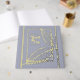 Wedding foil guest book featuring a modern leaves design. Muted blue grey colour with a hint of lavender and real gold foil. Customise the front and side with your desired text. Great option for your wedding. Use the template to create your own modern leaves wedding foil guest book.