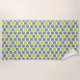 Modern beach towel features geometric hexagon pattern in 3 colours: white, grey, and lime green.