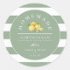 Modern chic limoncello favour stickers. Design features, watercolor lemons and leaves, dusty sage green and white stripe pattern background and template text lines for your name and event date.
