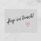 Keep your friends and family up-to-date with your new address using these simple, elegant enclosure cards. You can insert them into your mailings or share them in person, as you run into people you need to notify. When you want a distinctive method for letting your tribe know how to find you, this card is versatile enough for anyone. It features pretty typography graphics that read "We've Moved" on the front and "Keep in touch!" on the back, using a modern, casual, handwritten script font. I've placed a little house illustration on the front and red watercolor heart outline on the back, adding a distinctive touch. Use the template fields to add all your own details to personalise this design for your own use. If you'd like to change the pretty, simple sans-serif font I used for the editable text, or wish to move some lines elsewhere, click the link to customise the card further. The black type was placed over an editable light grey background; you can change this to any colour you wish. // 90 //