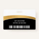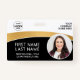 Represent your business in style by supplying staff with with modern and professional identification badges. Uploading your company logo, an employee photo, and your security barcode is easy and quick. Using the templates for your company name, employee name, job title, department/team/division, employee ID#, and expiration date is simple and straightforward. The black, gold foil and white design is classic yet trendy. This name badge provides security for your company and staff, while at the same time presenting corporate branding with a stylish appearance.
