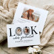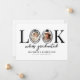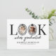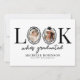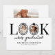 Celebrate a milestone in modern style with this quirky graduation announcement card. Featuring a clean white background and the fun saying “look who’s graduated”, the design cleverly uses the “O” as a photo frame, accented with a chic black bow and a graduation cap for a playful yet elegant touch.