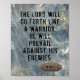 This inspirational masculine poster features the encouragement of the powerful Bible verse quote, "The Lord will go forth like a warrior. He will prevail against His enemies," from Isaiah 42:13, in rugged, distressed typography. It sits upon a rugged metal-look background with a copper plate and rivets to hold the Scripture reference. This is perfect for the young man who seeks the heart of the Lord and it will give him extra encouragement and strength as he is reminded that the Lord will fight for him. This quote can also be changed to a verse of your own, if desired.