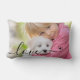 Modern LOVE Photo Script Heart 1 or 2 Pictures Lumbar Pillow. Create your own photo pillow with one or two full-bleed photos or images on the front and back featuring a modern, fancy calligraphy script title LOVE overlay accented with hearts in your choice of text and heart colours (shown in black). ASSISTANCE: For help with design modification or transferring the design to another product, contact the designer BEFORE ORDERING via the Zazzle Chat MESSAGE tab or email makeitaboutyoustore@gmail.com.