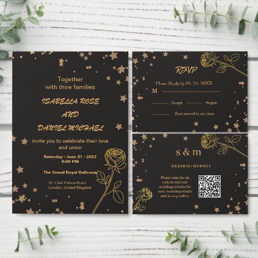 Provide your guests with a seamless way to access your wedding details with this elegant QR code enclosure card. Featuring a sophisticated gold foil aesthetic and clean minimalist typography, it's designed to complement your luxury wedding suite. Guests can easily scan the code to visit your wedding website for travel info, gift registries, and online RSVP. Fully customizable with your personal monogram and website link..