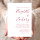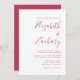 This simple modern wedding invitation features magenta text on a white background. Add the names of the bride and groom in stylish handwriting calligraphy and the details in sans serif font. The reverse side is a matching shade of solid magenta.