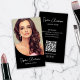 Create a professional and modern business card with a custom photo on the front and personalised details, plus a scannable QR code on the back for easy networking, and editable social media icons. Easily adjust fonts, colours, background, and layout to perfectly match your style. Ideal for makeup artist, hair stylist, Beauty Salon, and businesses looking to offer a thoughtful and professional presentation!