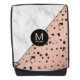 An ultra-stylish personalised backpack with a trendy rose gold pattern and black spots pattern combined white a marble pattern. A round black frame encircles your monogram and name. Edit the sample text with your desired text. This design is great for back to school, friends, family, students, and co-workers.