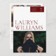 This modern graduation announcement features a single horizontal photo on the bottom accented by large type with the graduate's name. The school name and graduation year are highlighted on the top of the announcement on a maroon background. This graduation announcement has a professional and business orientated look, perfect for highlighting the graduate's successes. The back of the announcement contains two additional photos which can be used to showcase childhood photos of the graduate growing up, along with a space for a longer message. The accent colour can be adjusted to match your school's colours.