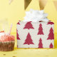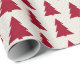Modern Christmas pattern features maroon geometric trees in varying sizes on a beige background with faux texture. Perfect for elegant holiday wrapping.