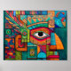 At the centre of this piece is the powerful symbol of the eye, rendered with intricate patterns and a spectrum of colours that suggest a deep cultural narrative reimagined for the present day. Surrounding it, a myriad of geometric shapes and symbols tell a story of epochs colliding, of tradition woven seamlessly with the pulse of contemporary life.