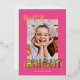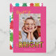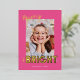 This fun, bright Christmas holiday photo card features real foil text reading, "Merry & BRIGHT."  The background colour can be customised to any colour you'd like (shown in bright magenta pink). The back of the card has an overlapping colourful Christmas trees tissue paper design, which has a crafted, decoupage look. This lighthearted card evokes a sense of playfulness, laughter, and childhood joy in the simple things.