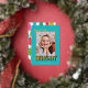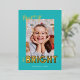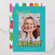 This fun, bright Christmas holiday photo card features real foil text reading, "Merry & BRIGHT."  The background colour can be customised to any colour you'd like (shown in aqua blue). The back of the card has an overlapping colourful Christmas trees tissue paper design, which has a crafted, decoupage look. This lighthearted card evokes a sense of playfulness, laughter, and childhood joy in the simple things.