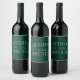Modern Christmas wine label featuring "Merry and Bright" in white lettering and green background with subtle white dots. Personalise the green holiday wine label with your custom greeting and family name in white lettering.