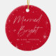 Modern holiday photo ornament featuring "Married and Bright" displayed in a hand-lettered script encircled by a border of white stars against a red background. Personalize the front of the ornament by adding your name and the year. The back of the ornament features your wedding photo making it the perfect keepsake for your first Christmas as a married couple.