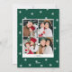 Simple and elegant holiday card featuring a 3 photo collage on the front with "Merry Christmas" displayed in white modern lettering on a green background. Personalise the front of the card by adding your photos and name. The card reverses to display 4 additional photos and the year with a white snowflake pattern background. The multi-photo holiday card is perfect for displaying all of your favourite family photos!
