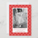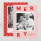 Send stylish holiday greetings to friends and family with a modern holiday photo card! The word "Merry" is scattered across the top and bottom of the design in a bold, red modern font with a light pink background. Your favourite family photo is displayed in the centre of the card with a white square frame. Personalise the front of the trendy holiday card by adding your name and the year. The card reverses to feature an additional photo, your custom message and your names with a red and white modern plaid pattern background. Designed to coordinate with our Modern Merry Letters holiday collection.