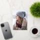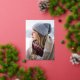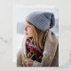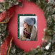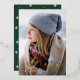 Modern holiday photo card featuring "Merry" displayed in a handwritten gold foil script overlaying your vertical photo. Personalise the front of the Christmas photo card with your family name and the year. The card reverses to a green and white snowflake pattern.