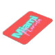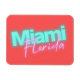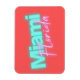 Modern and colourful typographic design features "Miami Florida" in aqua and pink neon text on salmon / coral background
