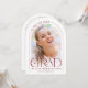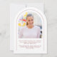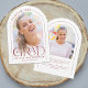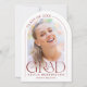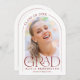 This red and white simple minimalist arch graduation announcement features a delicate arch frame, 2 photo templates and elegant modern typography.