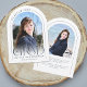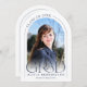 This navy blue and white simple minimalist arch graduation announcement features a delicate arch frame, 2 photo templates and elegant modern typography.