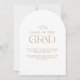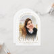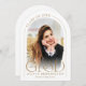 This gold and white simple minimalist graduation announcement features a photo, arch frame and elegant modern typography.