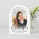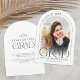 This black and white simple minimalist graduation announcement features a photo, arch frame and elegant modern typography.