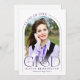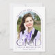 This purple and white simple minimalist graduation card serves as both a graduation announcement and grad party invitation, and features a photo, arch frame and elegant modern typography.